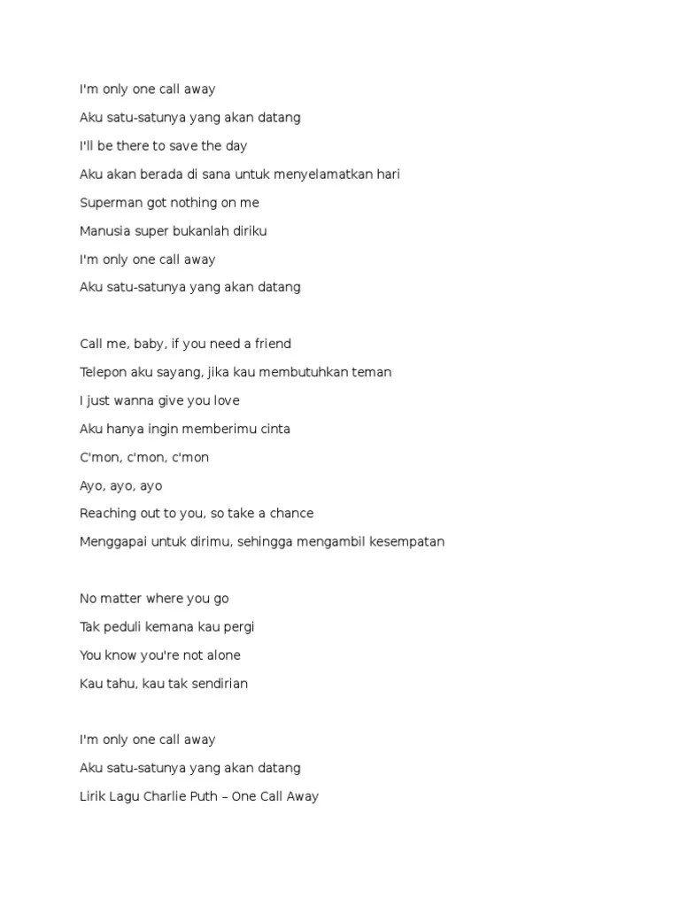 Ada yang tau maksud dari lagu 'one call away' milik charlie puth ini? Layanan mobile dari situs entertainment terbesar indonesia, kapanlagi.com. F c g i'll be there to save the day One call away merupakan lagu yang dipopulerkan sekaligus dinyanyikan oleh charlie puth. Come along with me and don't be scared.